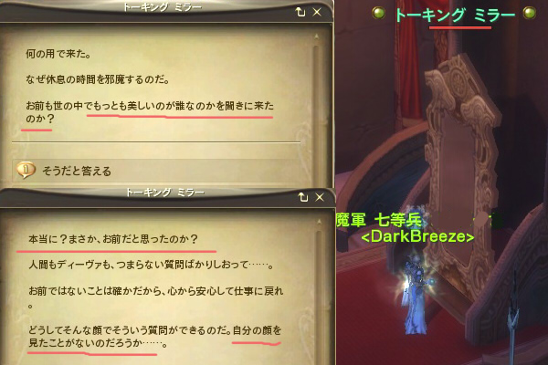 金曜日に1周してきた神殿でレジェボウが出て、レギメンさんを待つ間に、トーキングミラーと会話してみる。